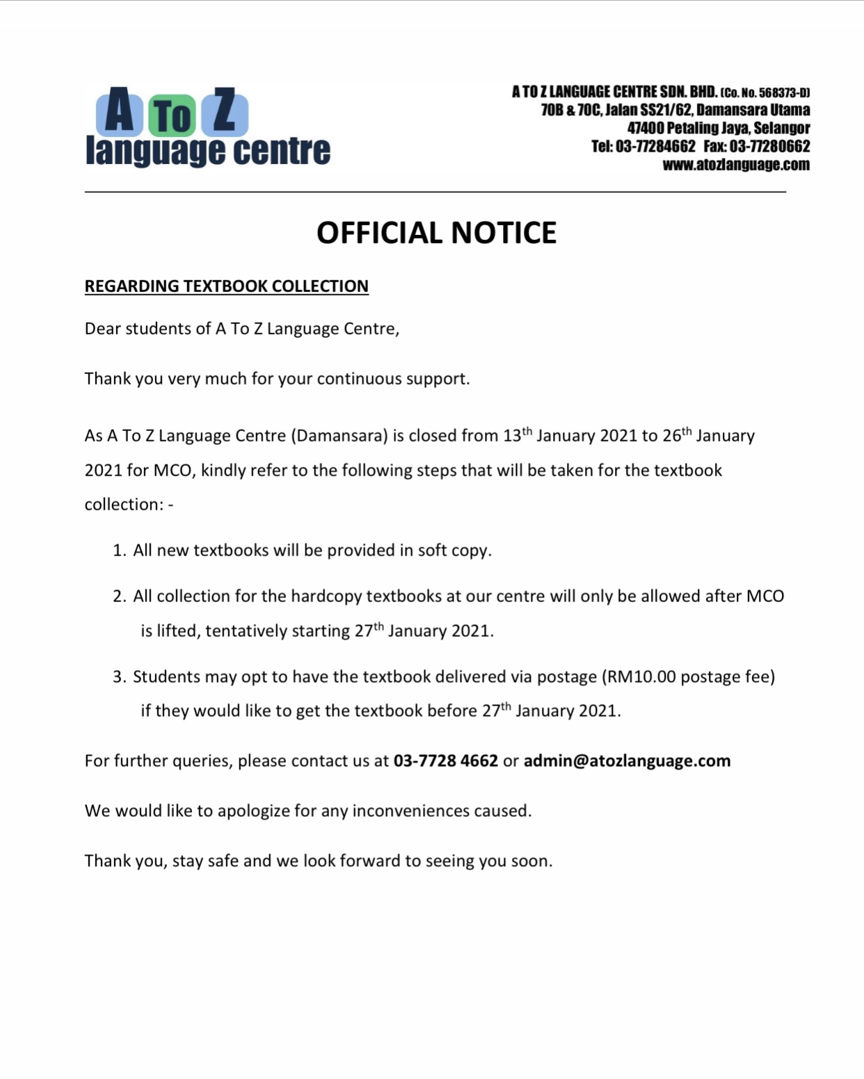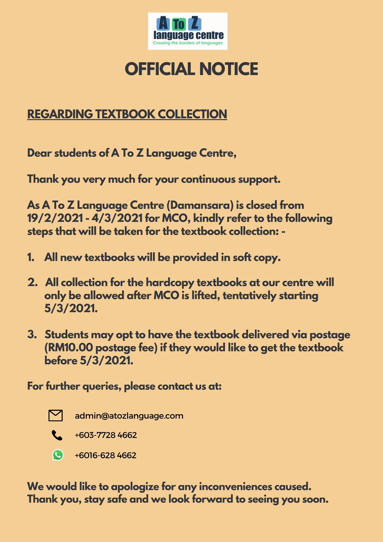 Textbook collection & postage during MCO 2021 (13 January – 26 January)