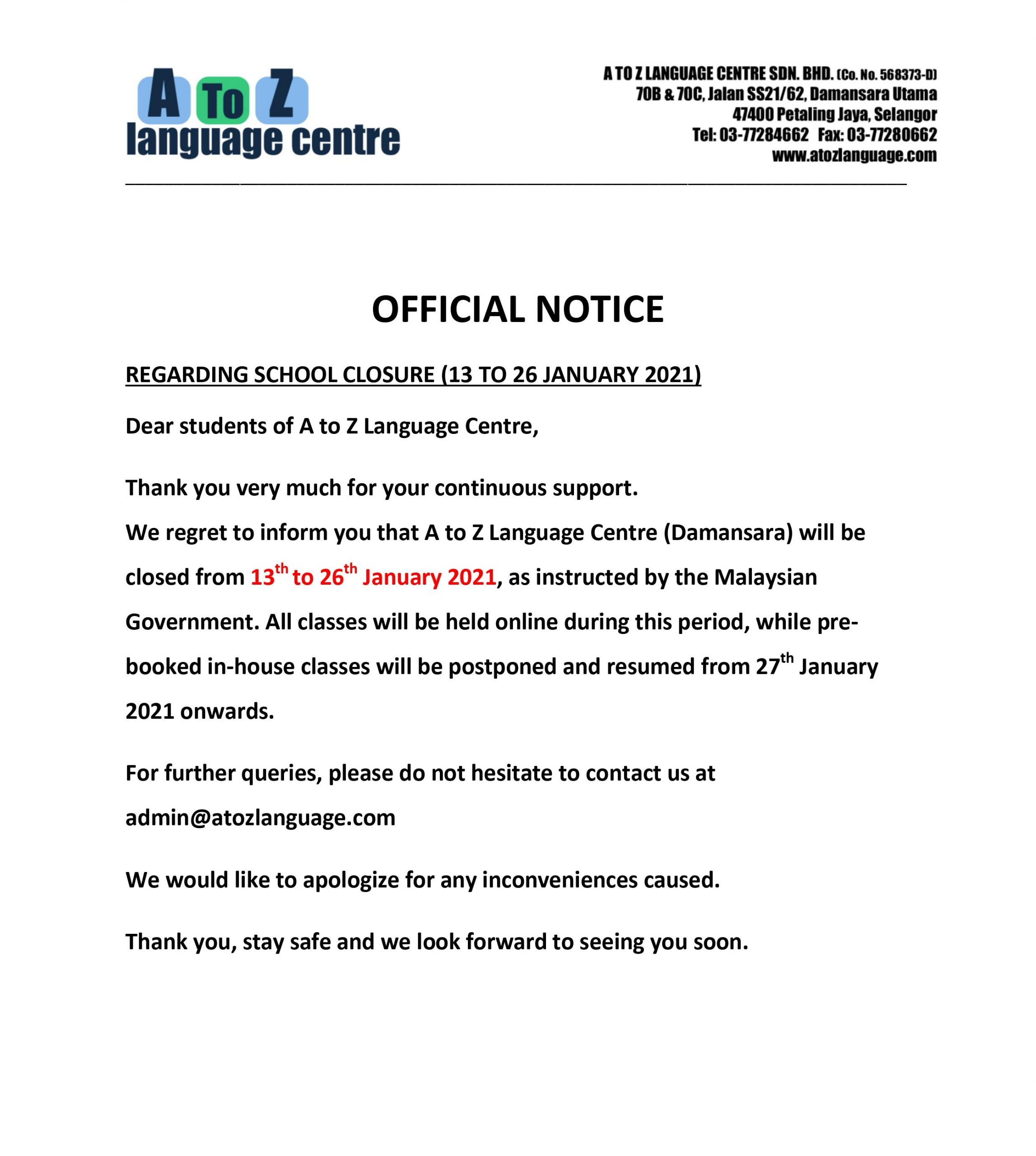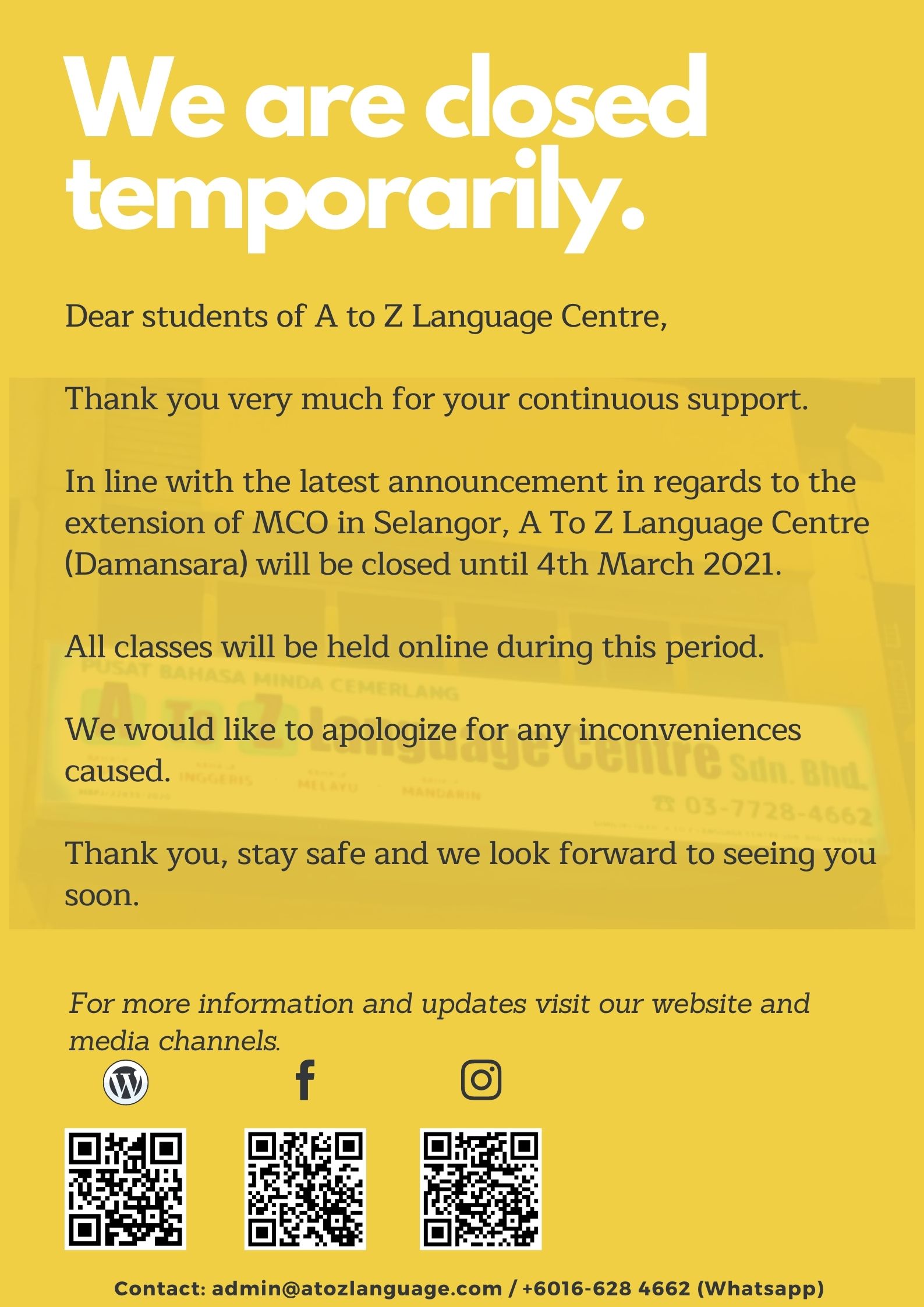 MCO Notice – Temporary Closure (13 January – 26 January 2021) [extended to 04 February]