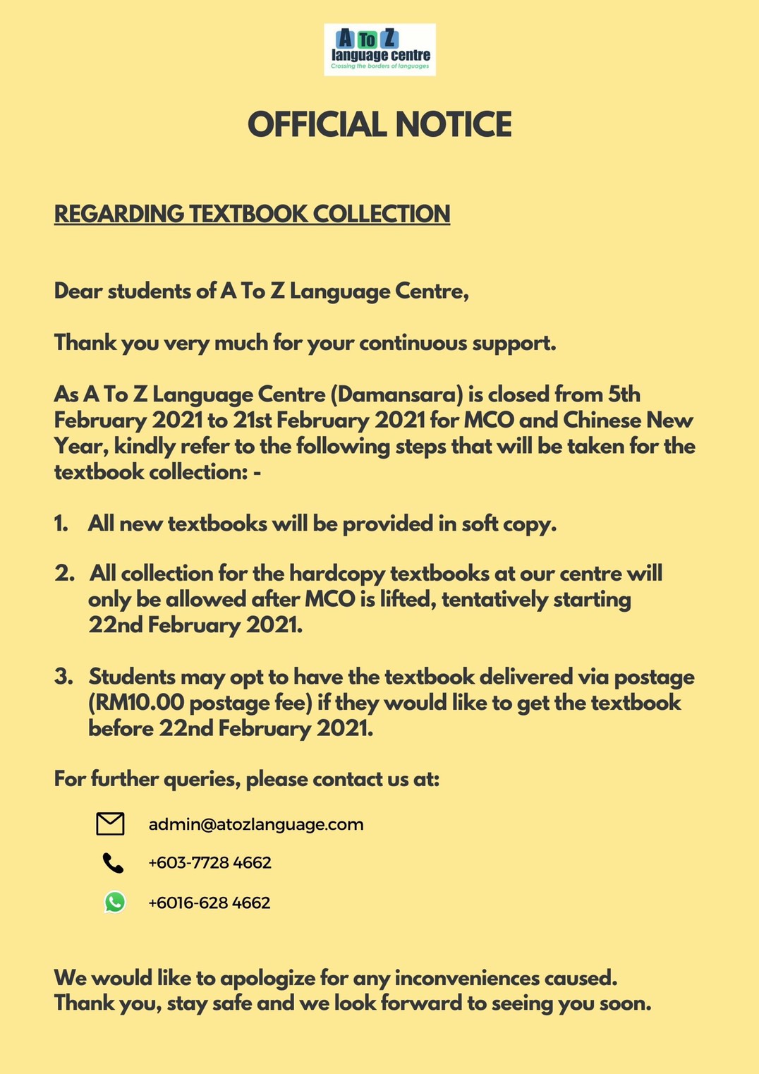 Textbook collection & postage during MCO 2021 (05 February – 21 February)