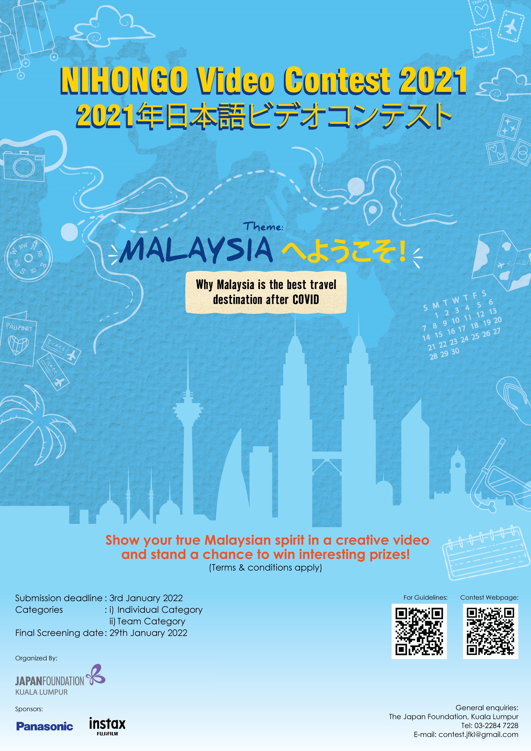 Contests NIHONGO Video Contest 2021 2021年日本語ビデオコンテスト December 1, 2021 About Contest Theme MALAYSIAへようこそ! Why Malaysia is the best travel destination after COVID Submission Deadline 03 January 2022 (MON) Final screening date 29 January 2022 (SAT) Categories 1 Individual Category Categories 2 Team Category Organizer Japan Foundation Kuala Lumpur (JFKL) More information can be found here Contest Website Frequently Asked Questions (FAQs) Read More